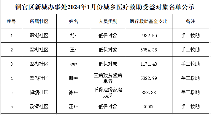 铜官区新城办事处2024年1月份城乡医疗救助受益对象名单公示(手工救助)-铜官区人民政府