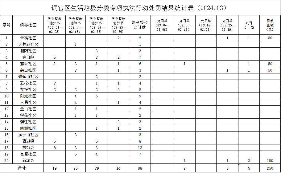 3月份,20个镇办社区城管中队在所辖区域内持续开展垃圾分类专项执法行动,共下达垃圾分类责令整改通知书88起,处罚决定书5起,罚款金额250元。
