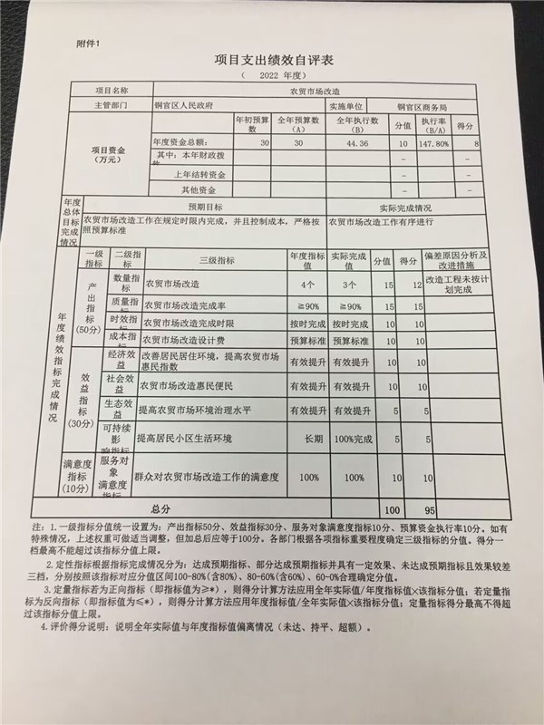 截至2022年底,共支付农贸市场改造经费44.36万元,绩效目标总体完成情况良好。