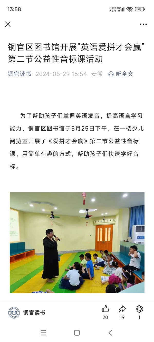 铜官区图书馆开展“英语爱拼才会赢”第二节公益性音标课活动-铜官区人民政府