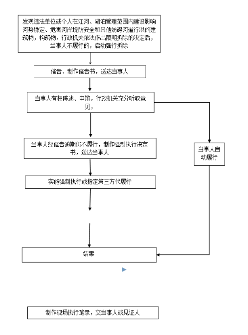 对在江河、湖泊管理范围内建设影响河势稳定、危害河岸堤防安全和其他妨碍河道行洪的建筑物,构筑物的强制拆除流程图