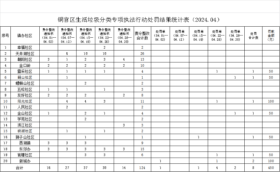 附件:2024年第4月份铜官区生活垃圾分类专项执法行动处罚结果统计表