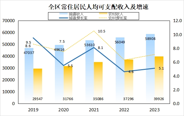 全年全区城镇居民人均可支配收入58908元,同比增长5.1%,农村人均可支配收入39926元,同比增长7.1%。