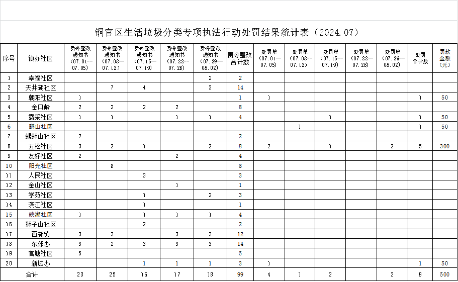 7月份,20个镇办社区城管中队在所辖区域内持续开展垃圾分类专项执法行动,共下达垃圾分类责令整改通知书99起,处罚决定书9起,罚款金额500元。