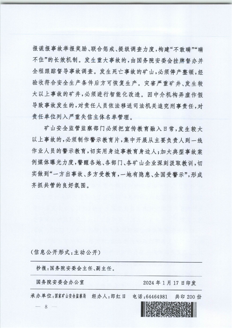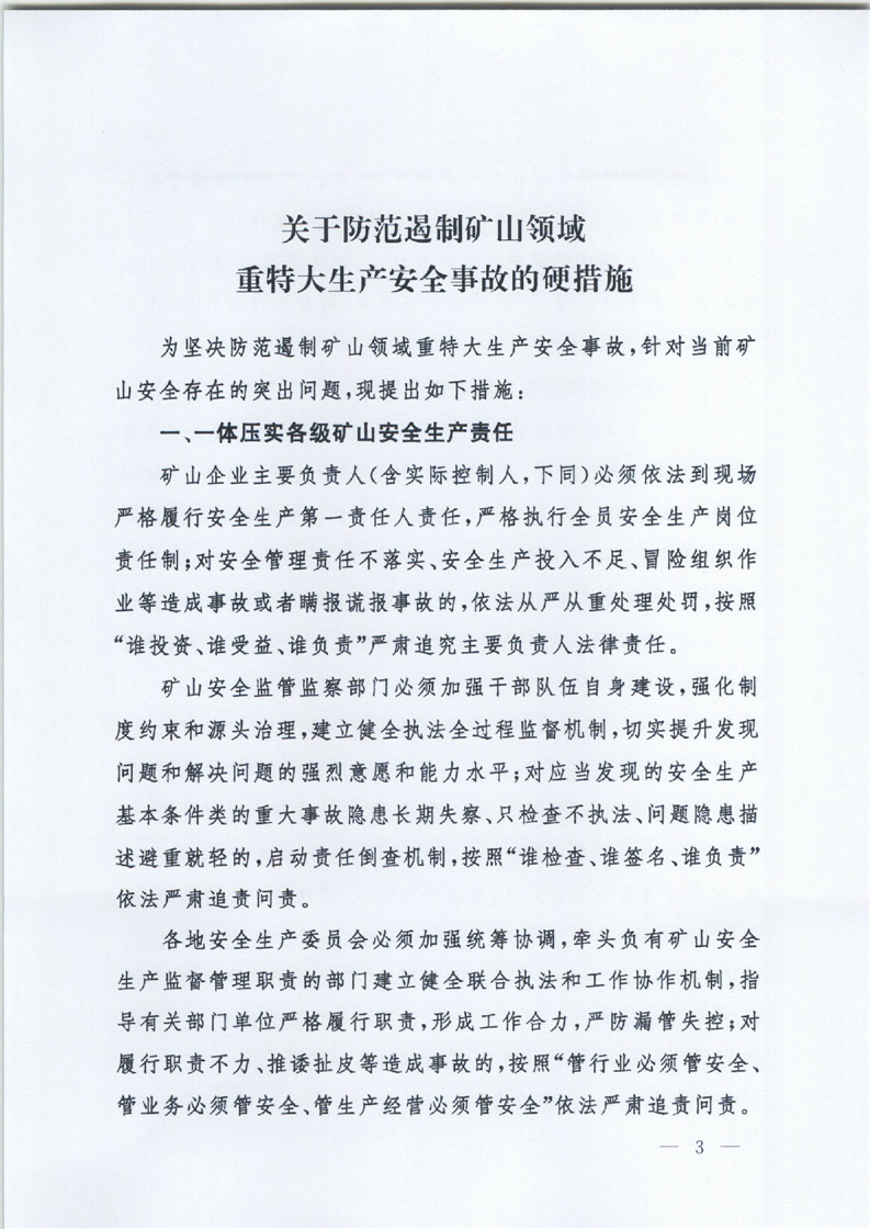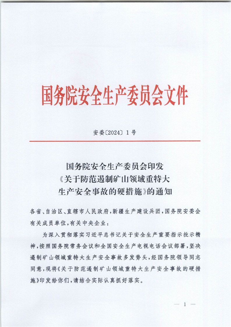 国务院安全生产委员会印发《关于防范遏制矿山领域重特大生产安全事故的硬措施》的通知