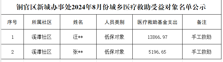 铜官区新城办事处2024年8月份城乡医疗救助受益对象名单公示(手工救助)