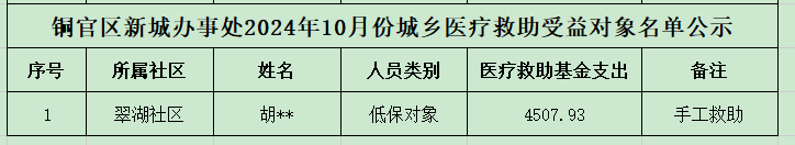 铜官区新城办事处2024年10月份城乡医疗救助受益对象名单公示(手工救助)