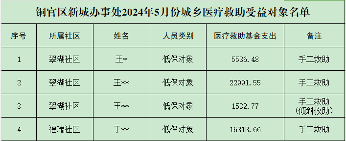 铜官区新城办事处2024年5月份城乡医疗救助受益对象名单