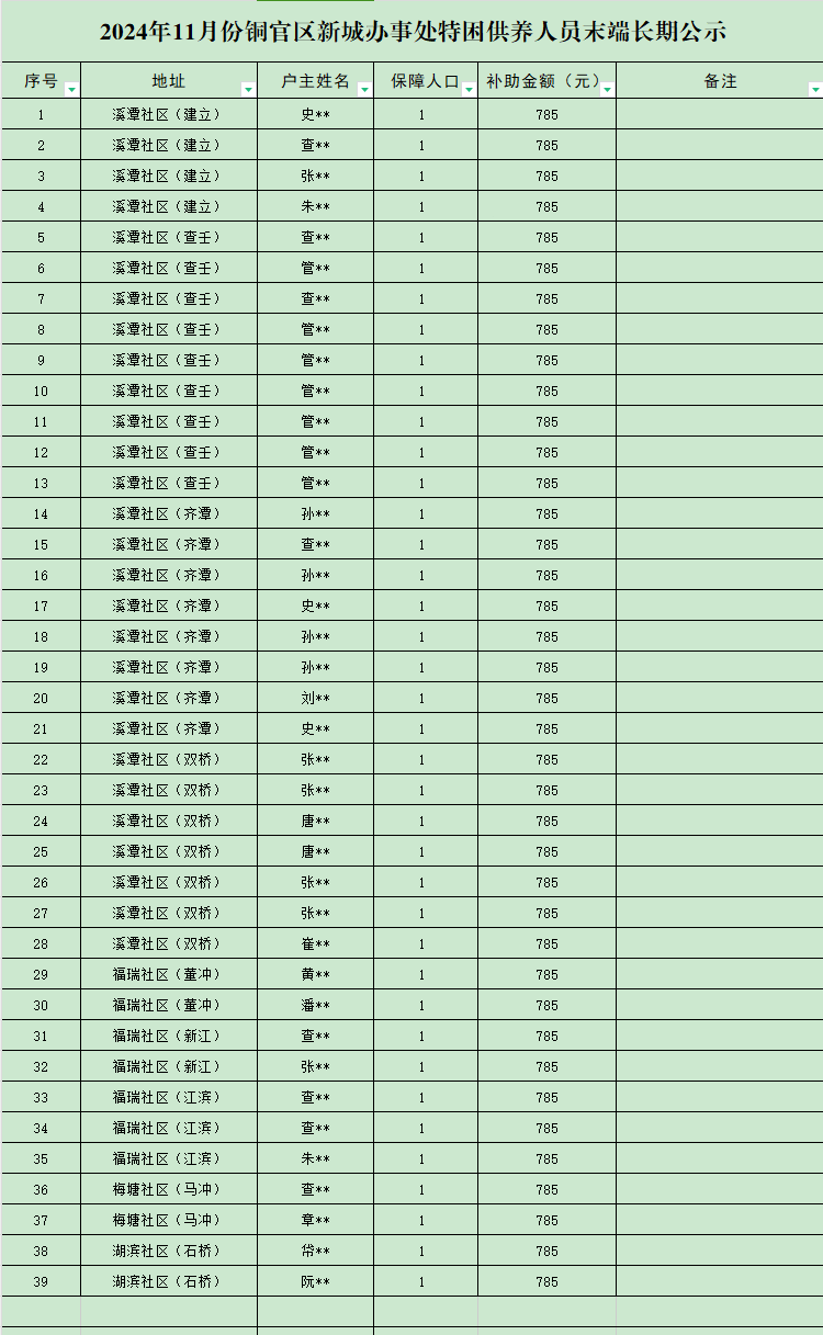 2024年11月份铜官区新城办事处特困供养人员末端长期公示-铜官区人民政府