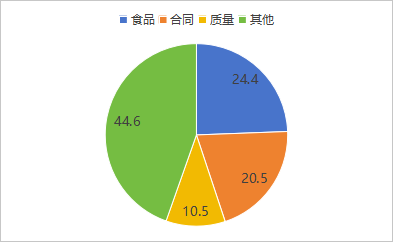2.从问题类型上看,食品类投诉以 1639 件居首,主要问题集中在食品过期、混入异物、食品变质、掺杂掺假及销售贮存法律法规禁止销售的食品等,投诉调解成功率约为71%,;合同类投诉共计 1377 件,问题主要集中在商家未按合同约定按期退款、商家无法兑现承诺,口头承诺内容有争议等;质量类投诉共计 704 件(同比下降 38%),主要问题集中在不符合国家强制性标准、产品掺杂掺假、以假充真、以次充好以及产品违反产品标识规定等;此外两品一械类投诉 203 件,其他类 2796 件。