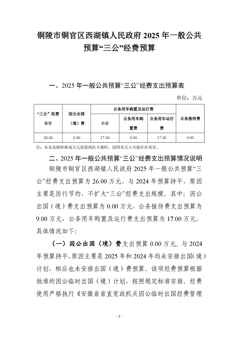 铜陵市铜官区西湖镇人民政府2025年一般公共预算“三公”经费预算-铜官区人民政府