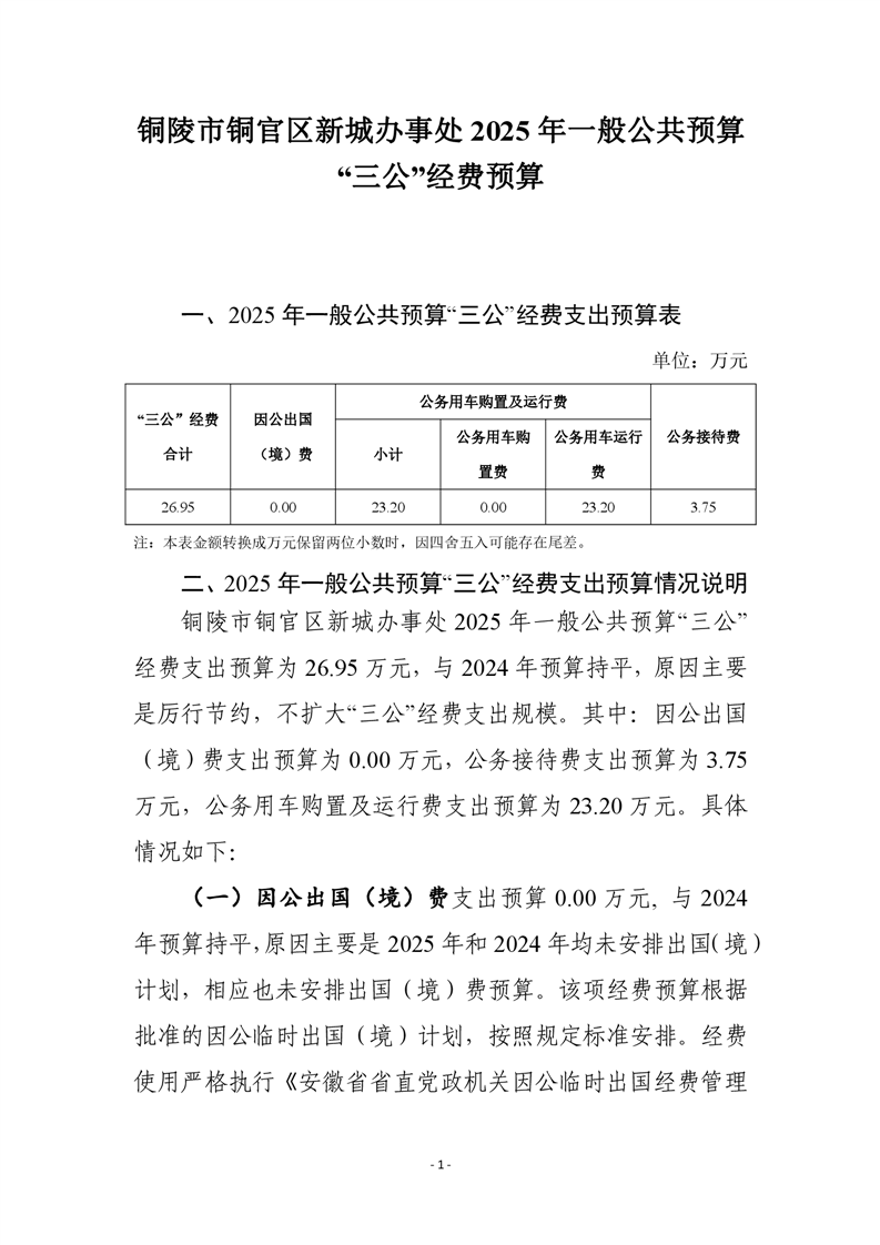 铜陵市铜官区新城办事处2025年度三公经费预算-铜官区人民政府