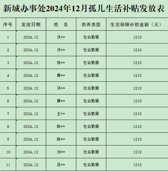 新城办事处2024年12月孤儿生活补贴发放表