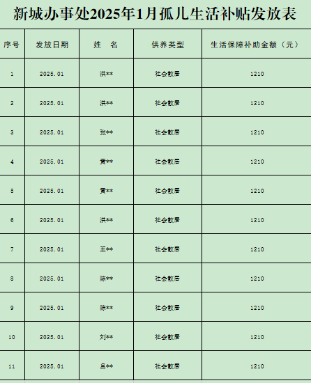 新城办事处2025年1月孤儿生活补贴发放表
