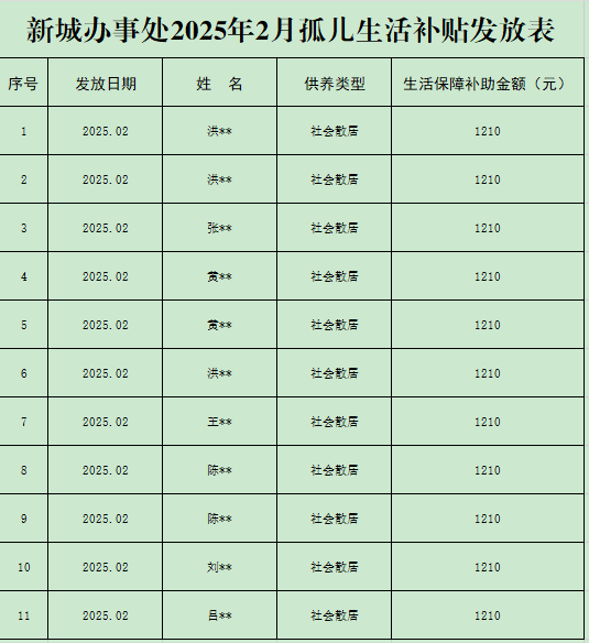 新城办事处2025年2月孤儿生活补贴发放表
