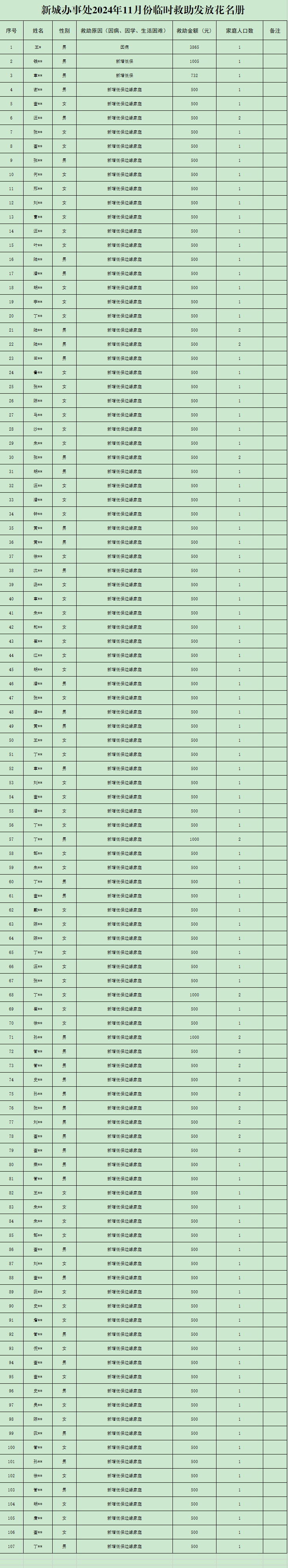 新城办事处2024年11月份临时救助发放花名册