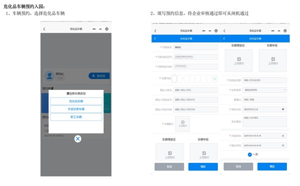 (1)园区内从事与生产、工作相关的员工私家车、单位公车、货车、非机动车辆及人员,由各单位统一通过园区安全风险智能化管控平台提前报备录入系统白名单,经审核后可以正常进出园区。