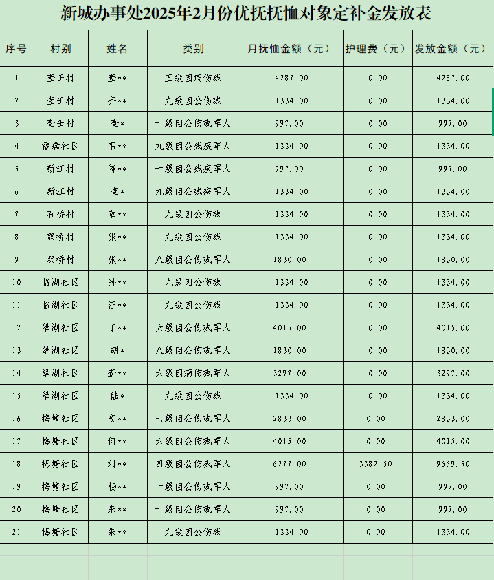 新城办事处2025年2月份优抚抚恤对象定补金发放表
