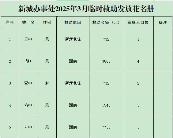 新城办事处2025年3月份临时救助发放花名册-铜官区人民政府