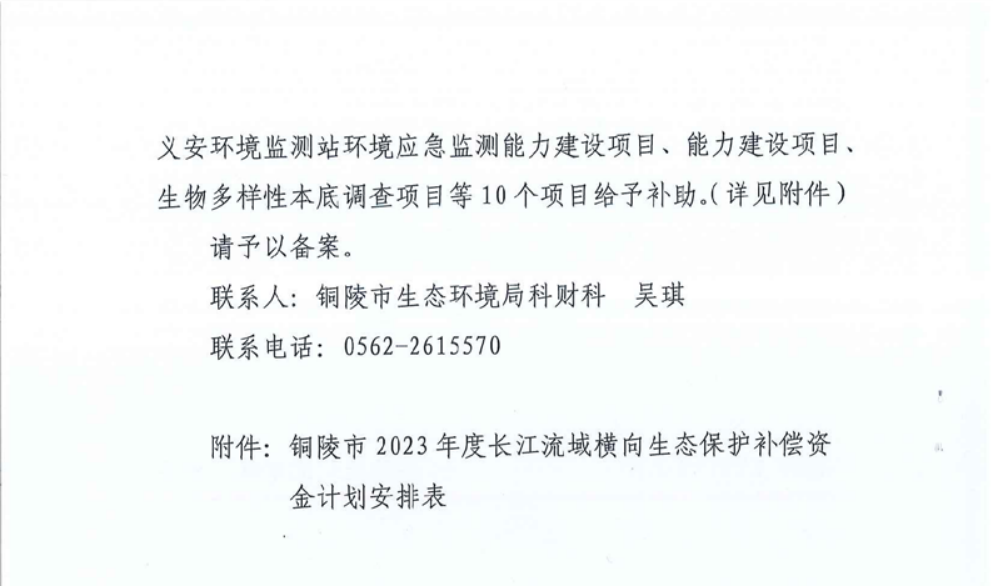 关于铜陵市2023年度长江流域横向生态保护补偿资金计划的报告
