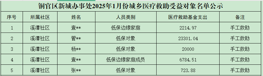 铜官区新城办事处2025年1月份城乡医疗救助受益对象名单公示(手工救助)