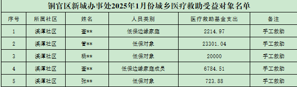 铜官区新城办事处2025年1月份城乡医疗救助受益对象名单(手工救助)