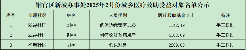 铜官区新城办事处2025年2月份城乡医疗救助受益对象名单公示(手工救助)
