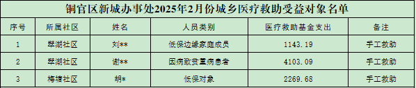 铜官区新城办事处2025年2月份城乡医疗救助受益对象名单(手工救助)