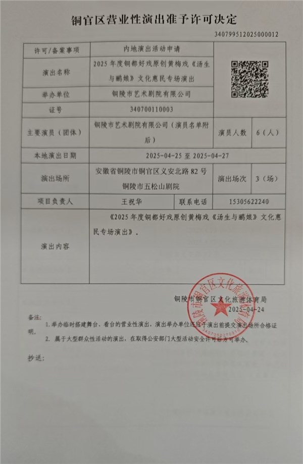 营业性演出——2025年度铜都好戏原创黄梅戏《汤生与鹂娘》文化惠民专场演出-铜官区人民政府