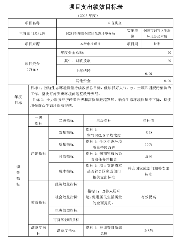 (1)项目概述。大气污染防治等污染防治工作。 (2)立项依据。依照铜环(2023)4 号文件规定。 (3)实施主体。铜陵市铜官区生态环境分局。 (4)起止时间。2025 年 1 月-2025 年 12 月。 (5)项目内容。用于污染防治,保障污染工作正常开展。 (6)年度预算安排。20 万元。 (7)绩效目标。