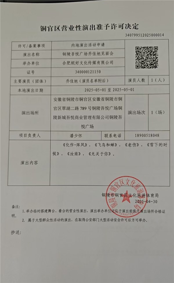 营业性演出——铜陵吾悦广场乔佳旭见面会-铜官区人民政府