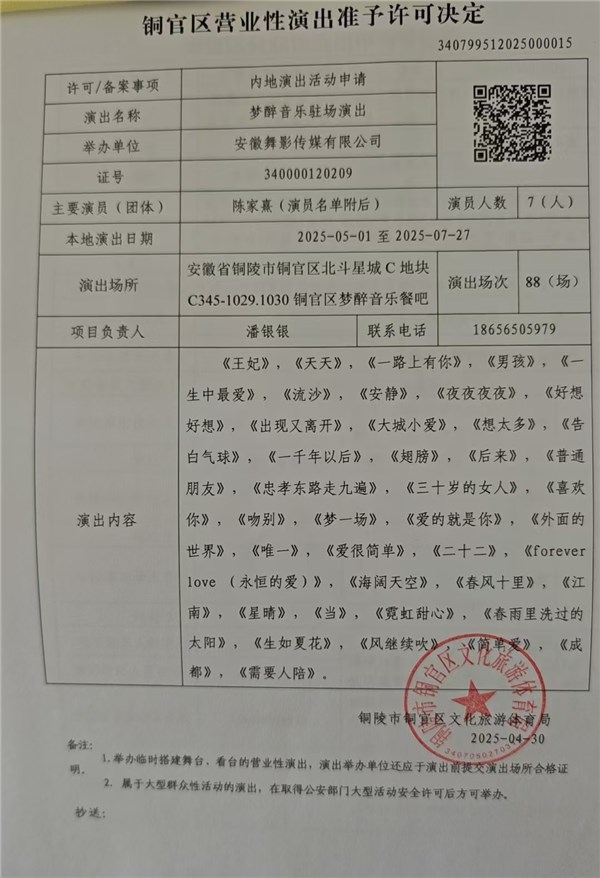 营业性演出——梦醉音乐驻唱演出-铜官区人民政府