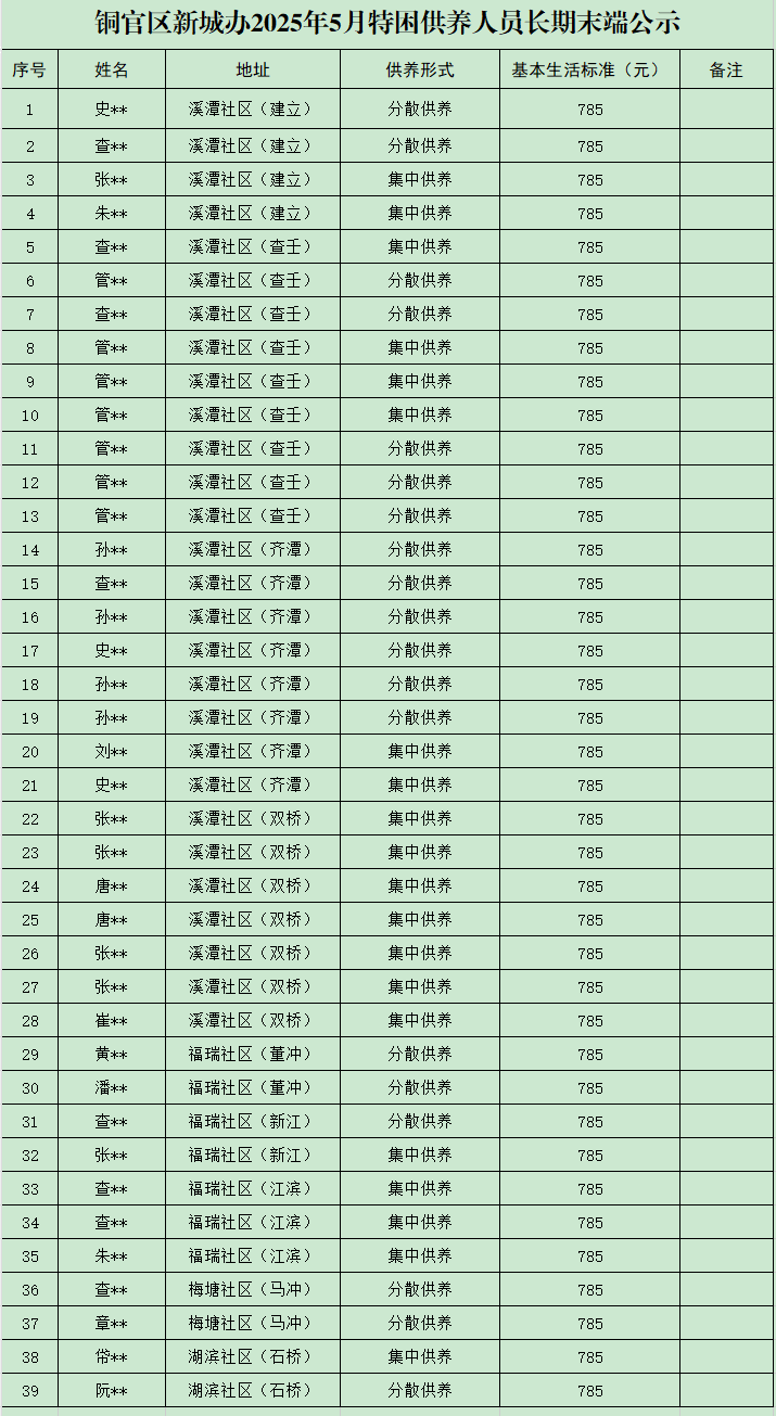 铜官区新城办2025年5月份特困供养人员长期末端公示
