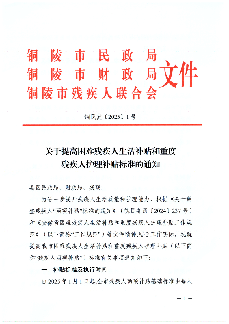 关于提高困难残疾人生活补贴和重度残疾人护理补贴标准的通知-铜官区人民政府