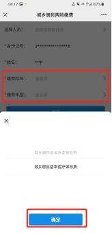 在险种选择页面,可供选择的只有城乡居民基本养老保险和城乡居民基本医疗保险,选择本次要缴费的险种后,点击页面下方“确定”按钮(如图8)。
