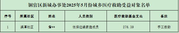 铜官区新城办事处2025年5月份城乡医疗救助受益对象名单(手工救助)