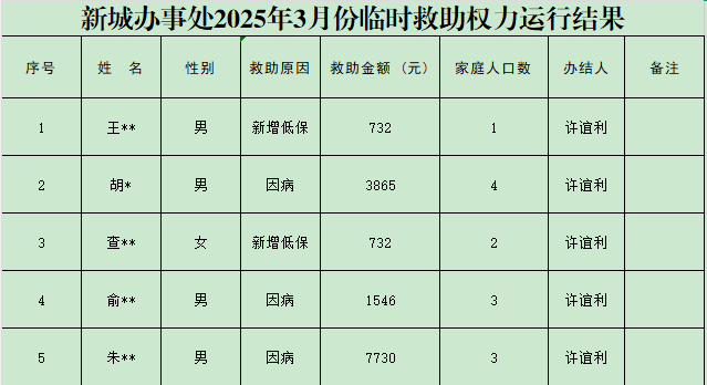 新城办事处2025年3月份临时救助权力运行结果-铜官区人民政府