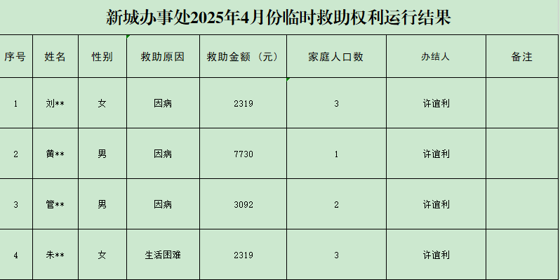 新城办事处2025年4月份临时救助权利运行结果