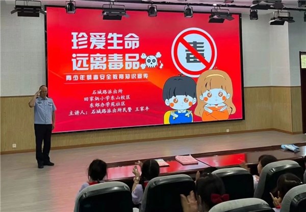 6月11日,东郊办学苑社区联合石城路派出所走进田家炳小学东山校区,开展禁毒反诈进校园活动,为学生健康成长护航。(东郊办)