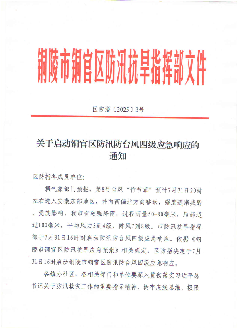 关于启动铜官区防汛防台风四级应急响应的通知-铜官区人民政府