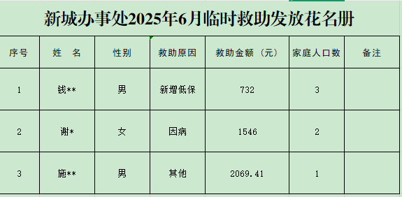 新城办事处2025年6月临时救助发放花名册