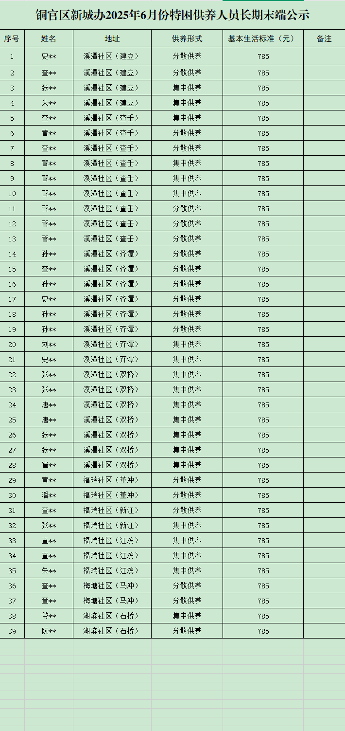 铜官区新城办2025年6月份特困供养人员长期末端公示-铜官区人民政府