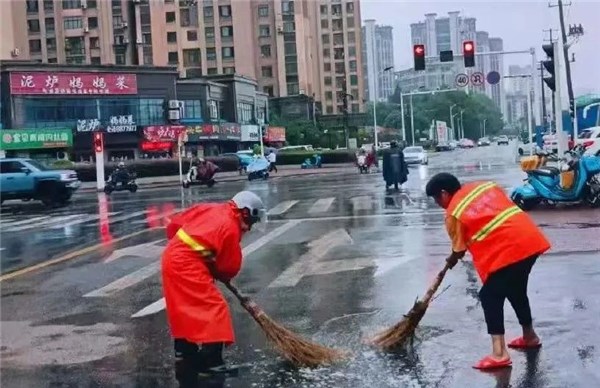 为护航市民出行,环卫工人以“人工清扫+机械冲洗”模式,快速清理路面树枝、落叶及散落垃圾,恢复路面整洁。
