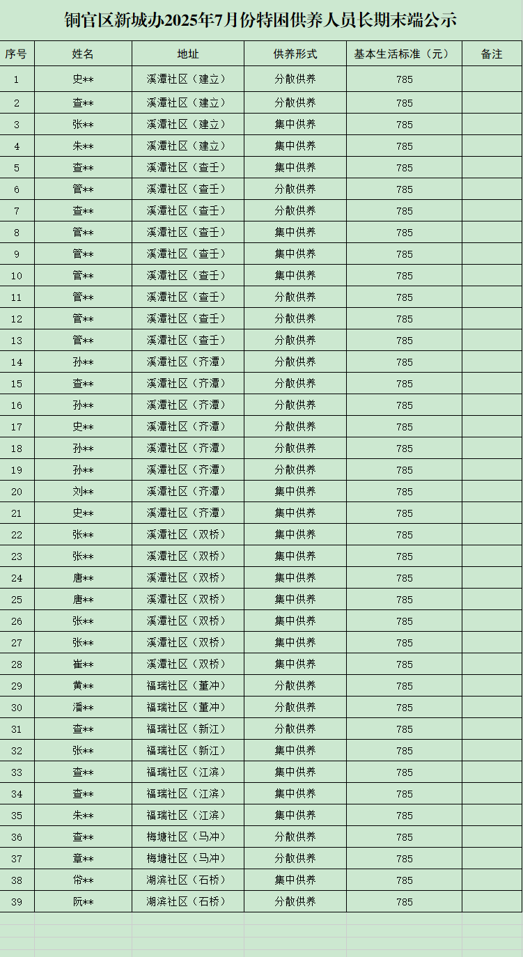 铜官区新城办2025年7月份特困供养人员长期末端公示
