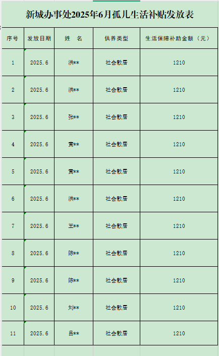 新城办事处2025年6月孤儿生活补贴发放表-铜官区人民政府