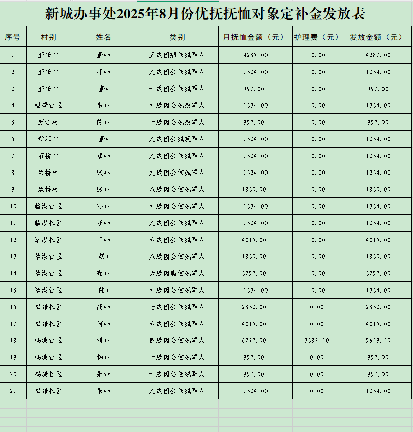新城办事处2025年8月份优抚抚恤对象定补金发放表