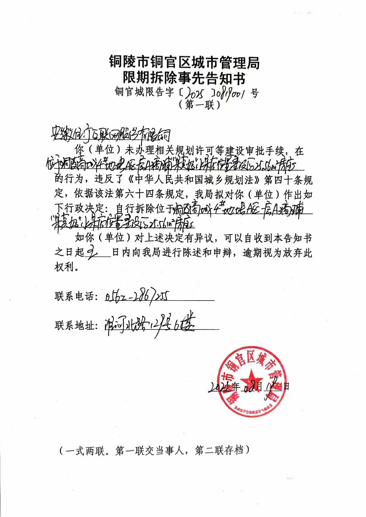 关于安徽住行互联网股份有限公司《限期拆除事先告知书》送达公告-铜官区人民政府