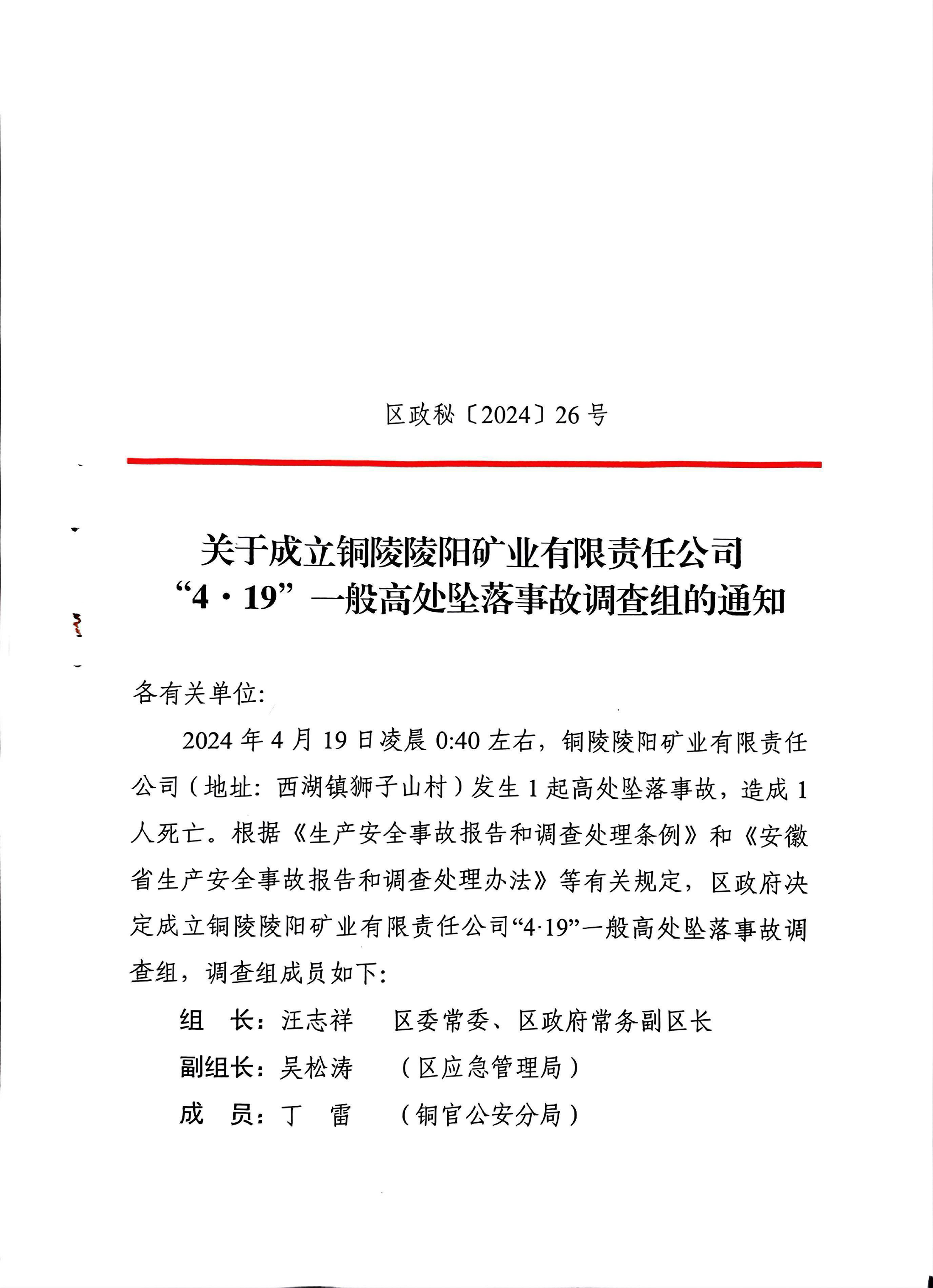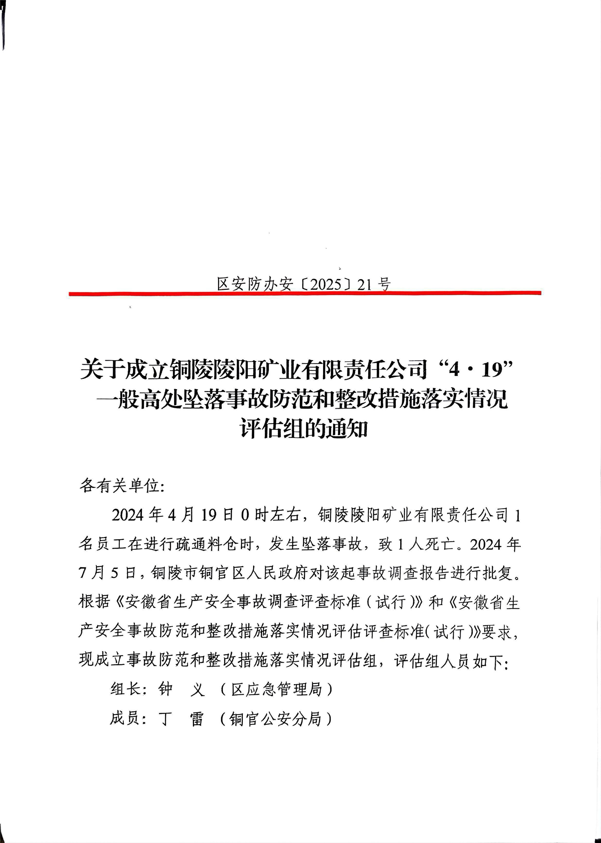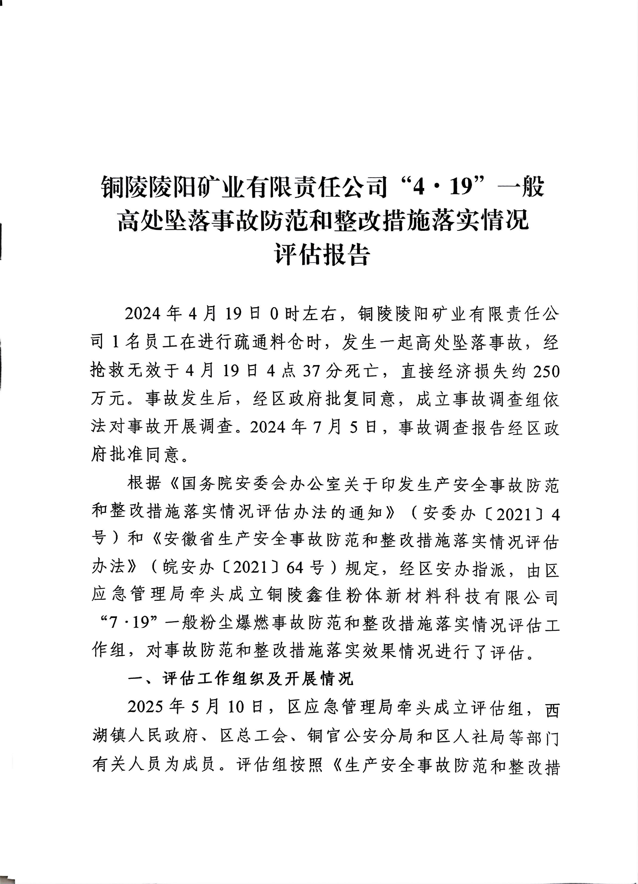 [事故处理防范措施落实情况评估报告]安徽铜陵陵阳矿业有限责任公司“4·19”一般高处坠落事故评估情况-铜官区人民政府