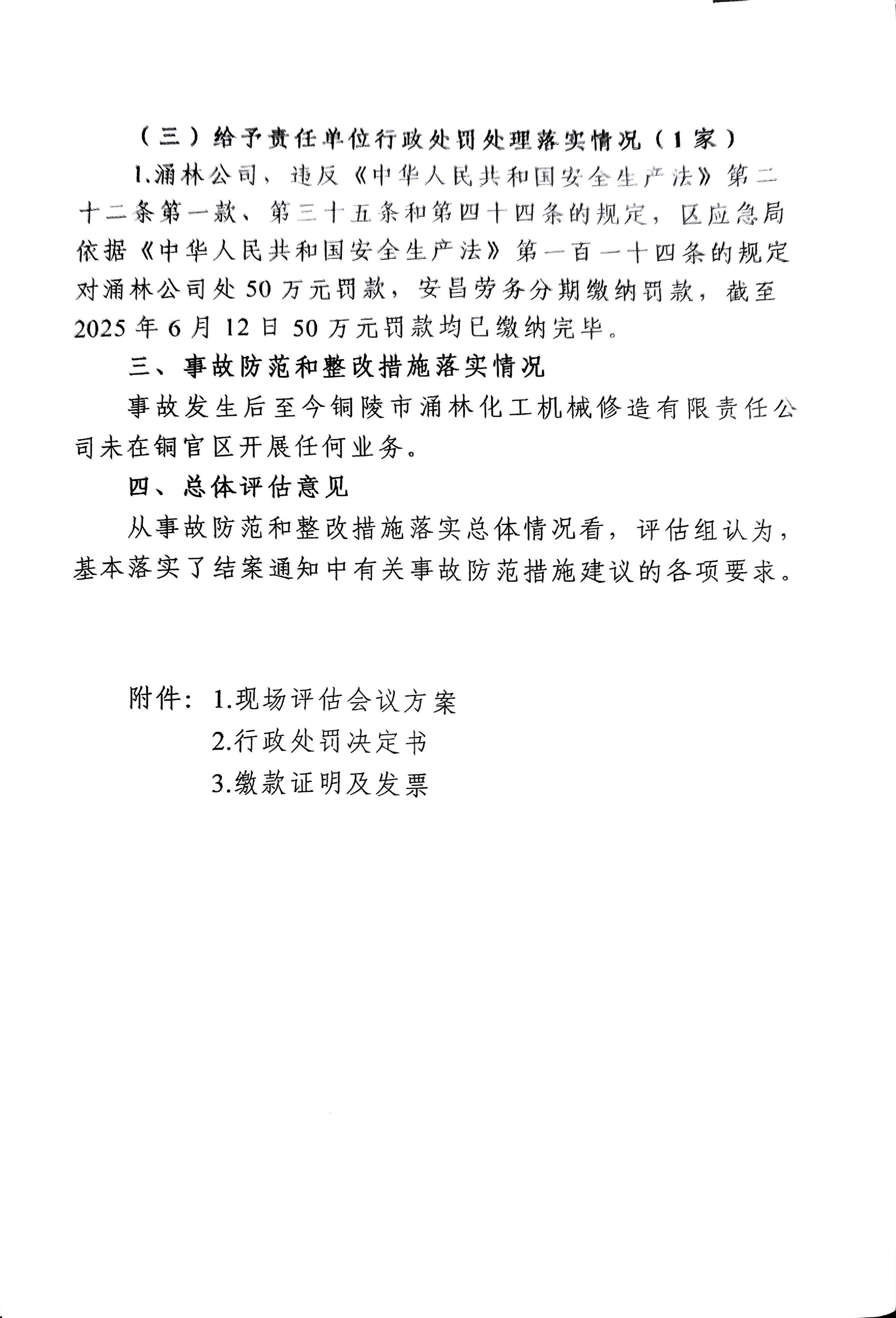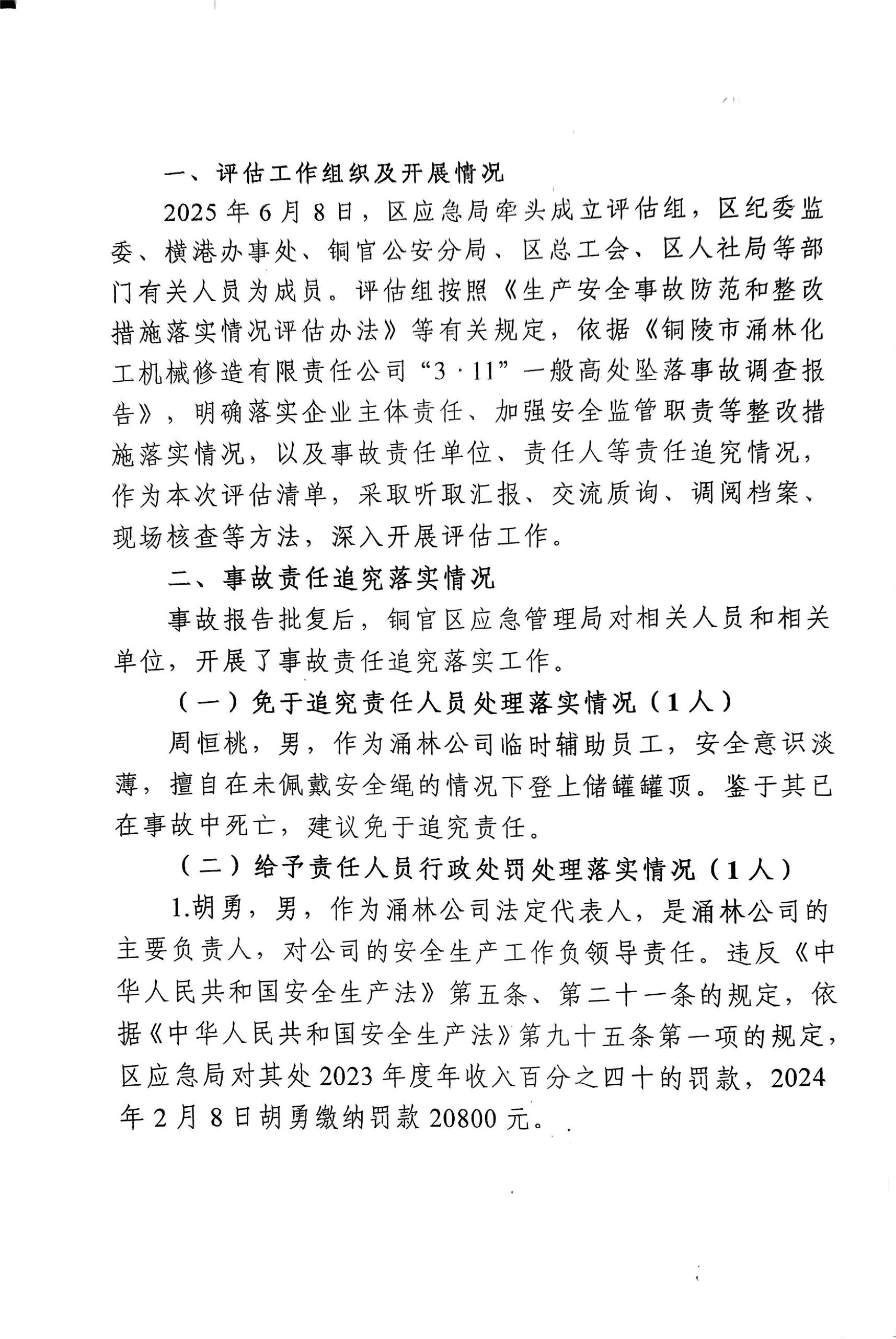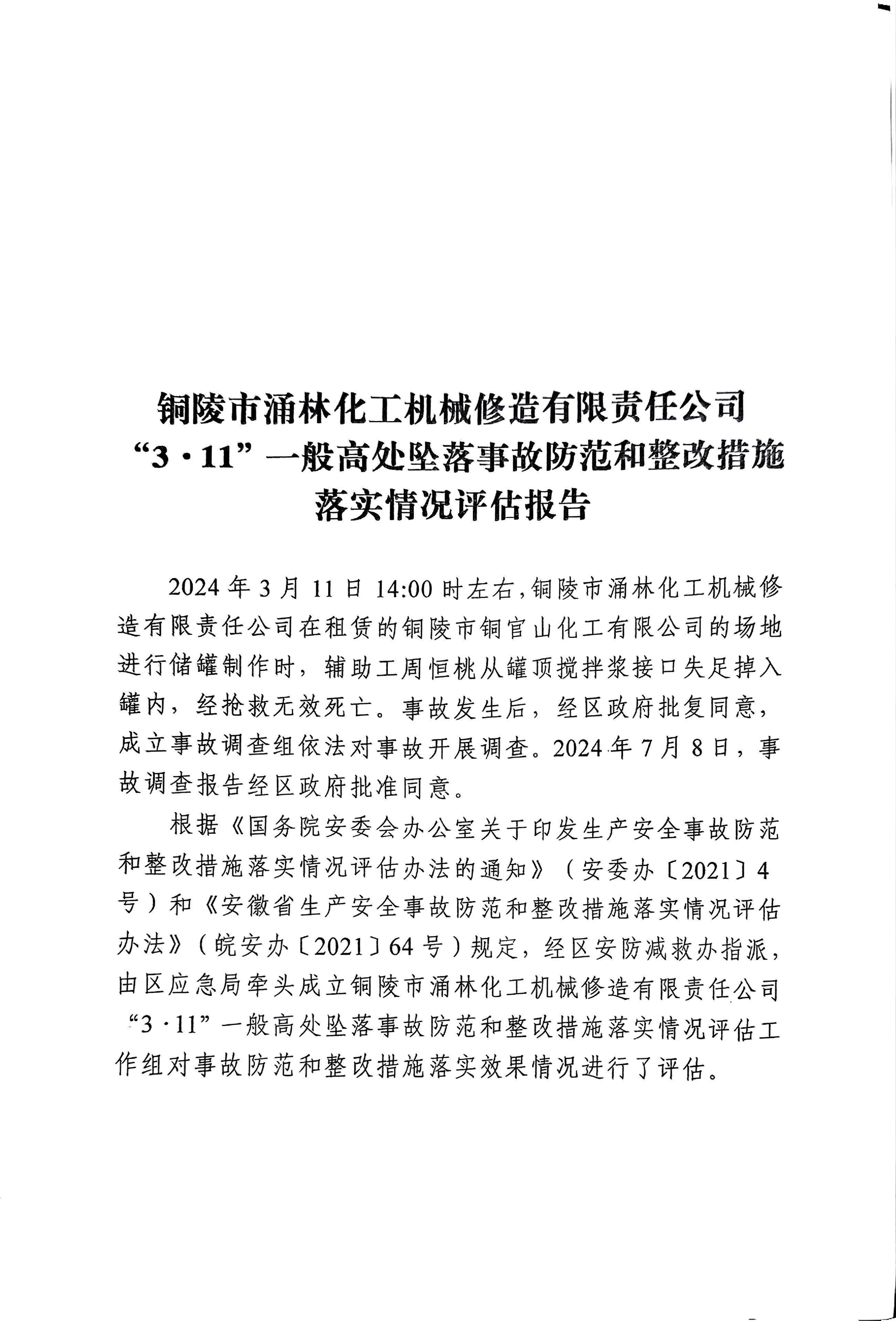 [事故处理防范措施落实情况评估报告]铜陵市涌林化工机械修造有限责任公司“3·11”一般高处坠落事故处理防范措施落实情况评估报告-铜官区人民政府