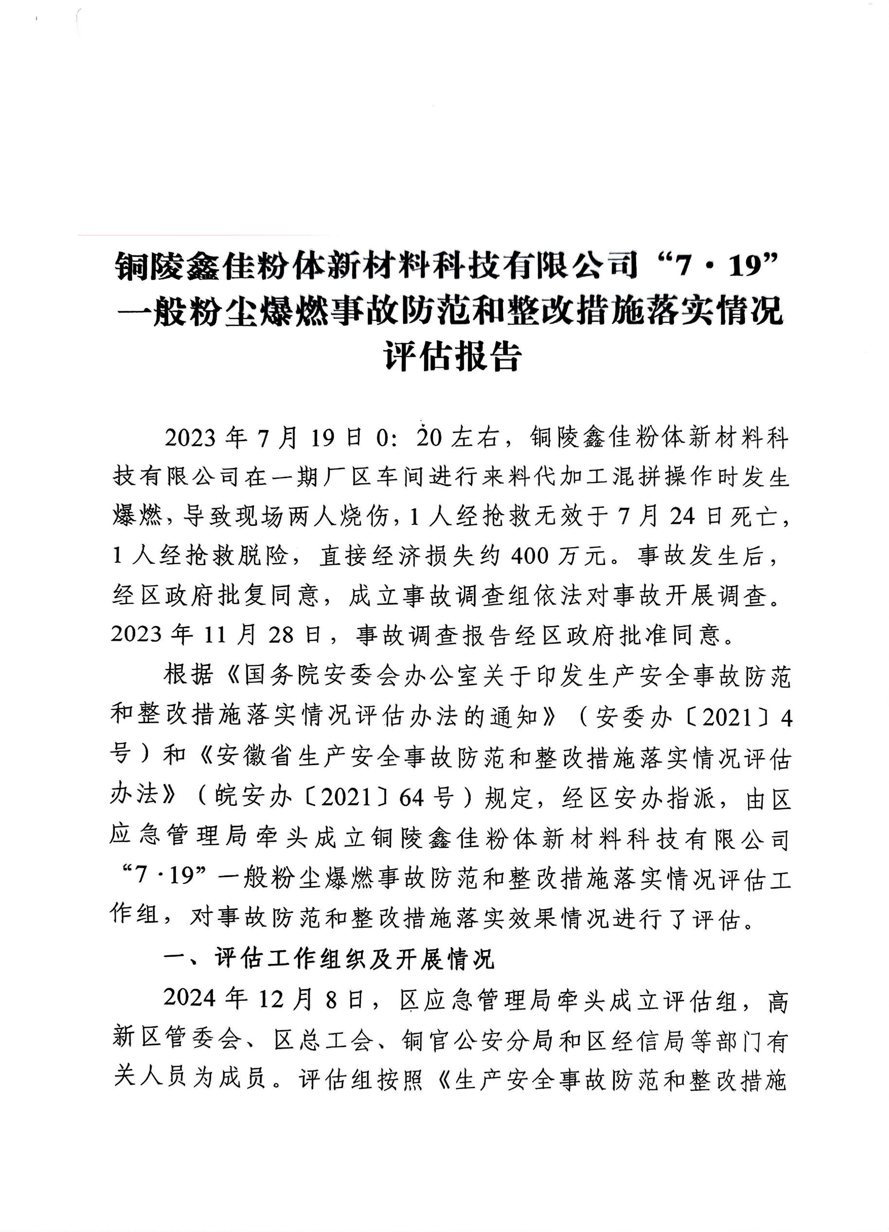 [事故处理防范措施落实情况评估情况]铜陵鑫佳粉体新材料科技有限公司“7·19”一般粉尘爆燃事故防范和整改措施落实情况